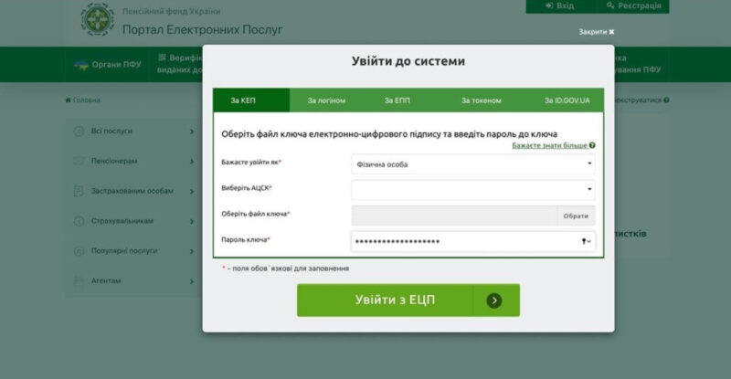 1. Увійдіть до свого особистого кабінету за допомогою CEP, ID.GOV.UA, токена або увійдіть з паролем, якщо ви вже зареєстровані;