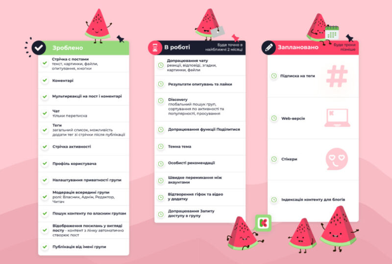 Ось і стали виникати ідеї продукту, який вирішив би цю проблему. Ще однією незручністю телеграм завжди вважав їх спосіб візуалізації постів у вигляді чату. Розумію, що це сталося через те що спочатку продукт був саме месенджером для листування, а не соціальною мережею. Звідси виникла друга ідея – створити продукт в якому б поєднувалися плюси месенджера і соціальної мережі. І ось тепер в Kawoon є і стрічка (по типу Фейсбук) і чат, як в звичному месенджері, і все це в рамках однієї групи.