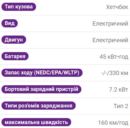 Автомобіль має дев’ять конфігурацій, дві версії двигуна (145 або 204 к.с.) і три версії акумулятора (48, 62, 82 кВт -год), причому невелика версія ще не продається, а прайс-лист починається з середньої батареї. Базова модель має пробіг WLTP 330 км, середня модель 416-426 (залежно від конфігурації) і старша модель 542-549 км.